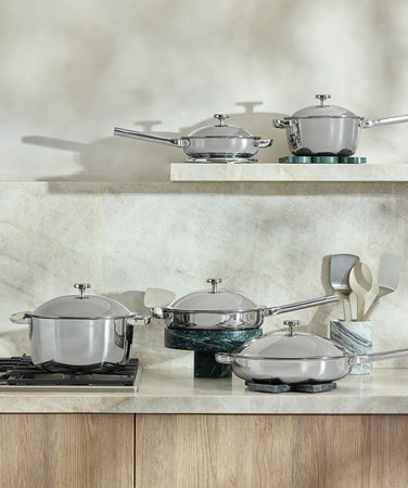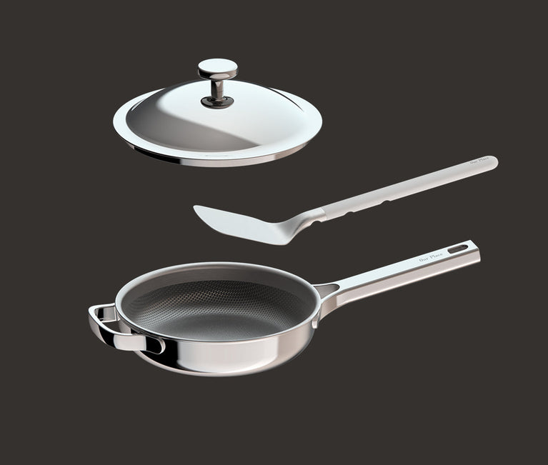 This technology is the very first of its kind, setting a new standard in cookware. It uses ultra-durable titanium, which is 300% harder than stainless steel, to create an interior surface that is virtually indestructible. Mimicking the lotus effect (the phenomenon of water droplets forming on leaves, rather than being absorbed), the pattern pressed into the titanium makes the interior naturally hydrophobic, which in turn creates a nonstick effect. The surface simultaneously sears (really well, we might add), while the sunken pockets create airflow and a nonstick experience.
